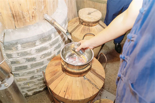“出酒嘍!淌好酒咯!”隨著釀酒師傅一聲口號,2023年頭排原酒順著甑桶的出酒口潺潺流出。